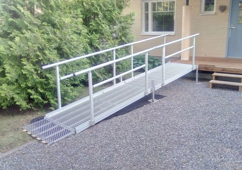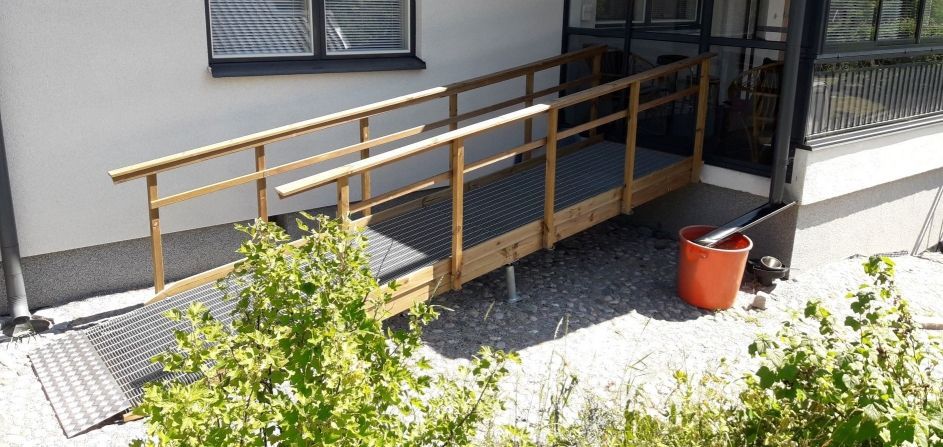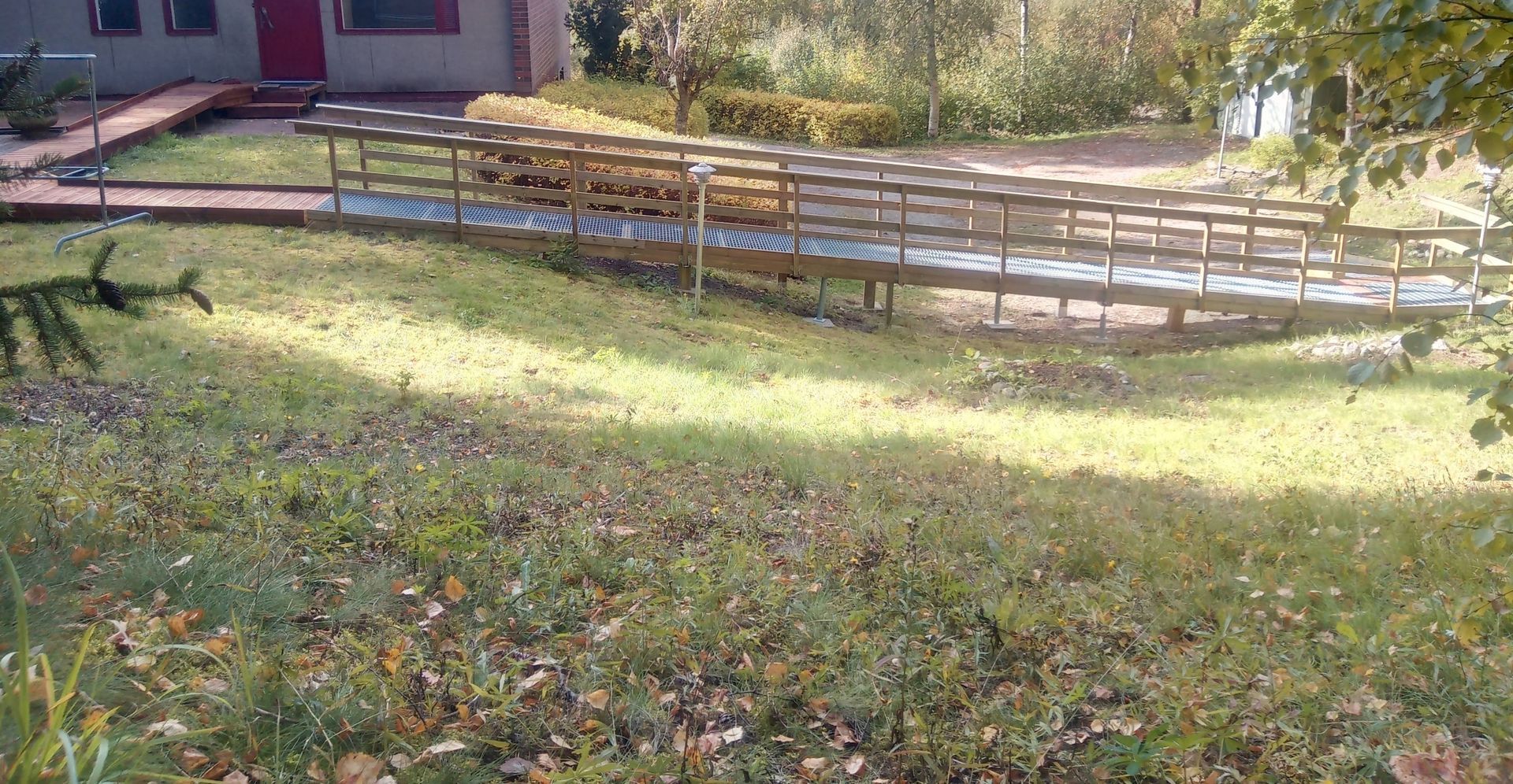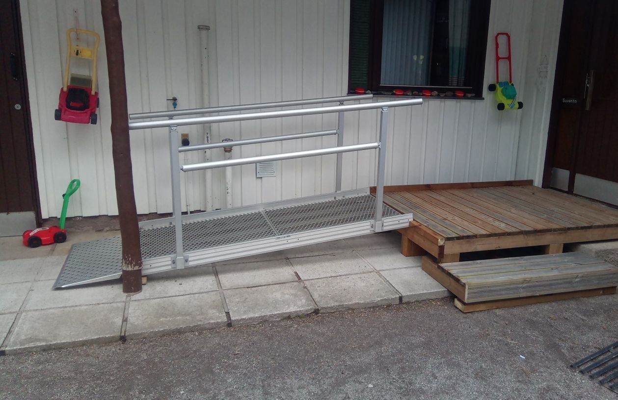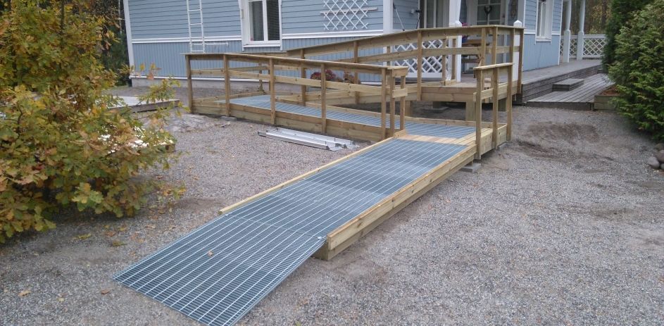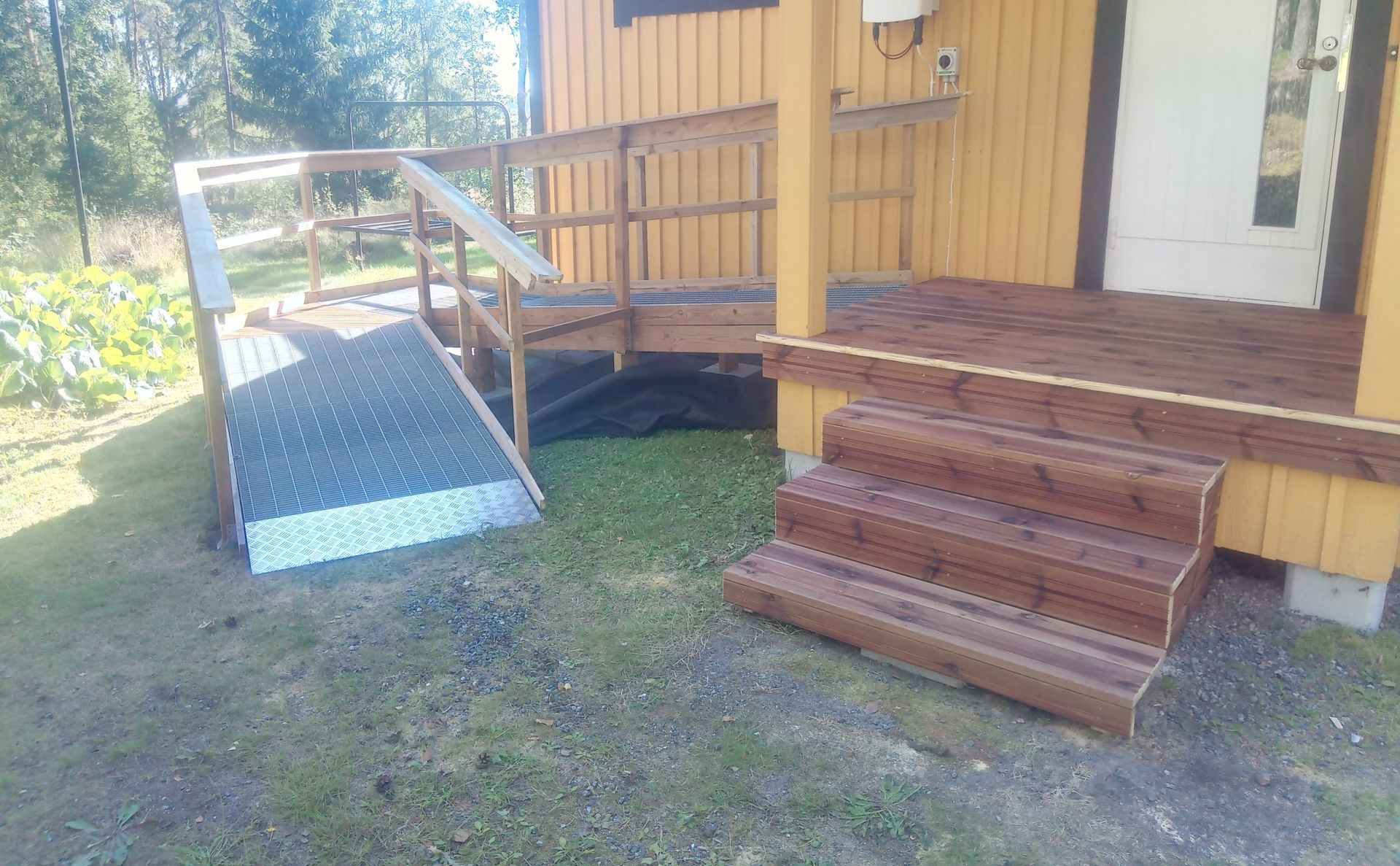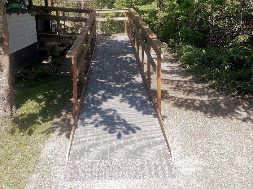 Runko ja kaiteet kestopuuta. Kulkutaso metalliturvaritilää. Maaston korkeusero ja rampin asennustila määrittelee rampin muodon