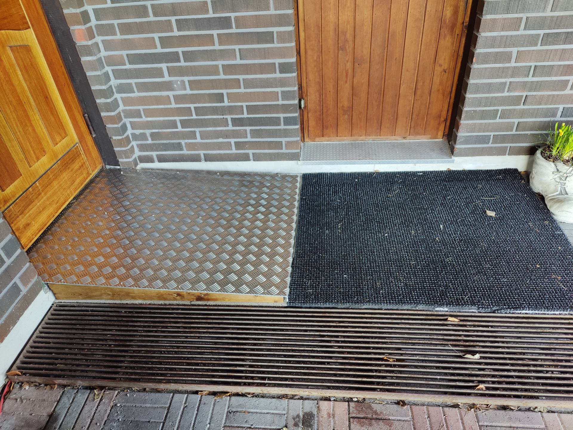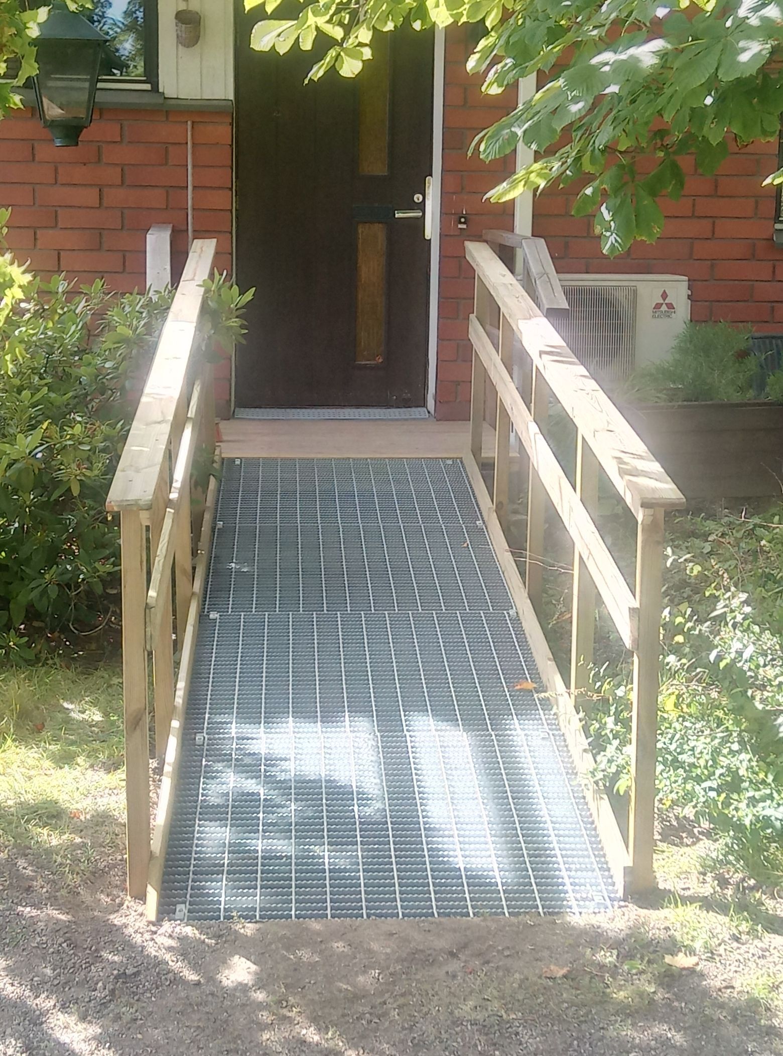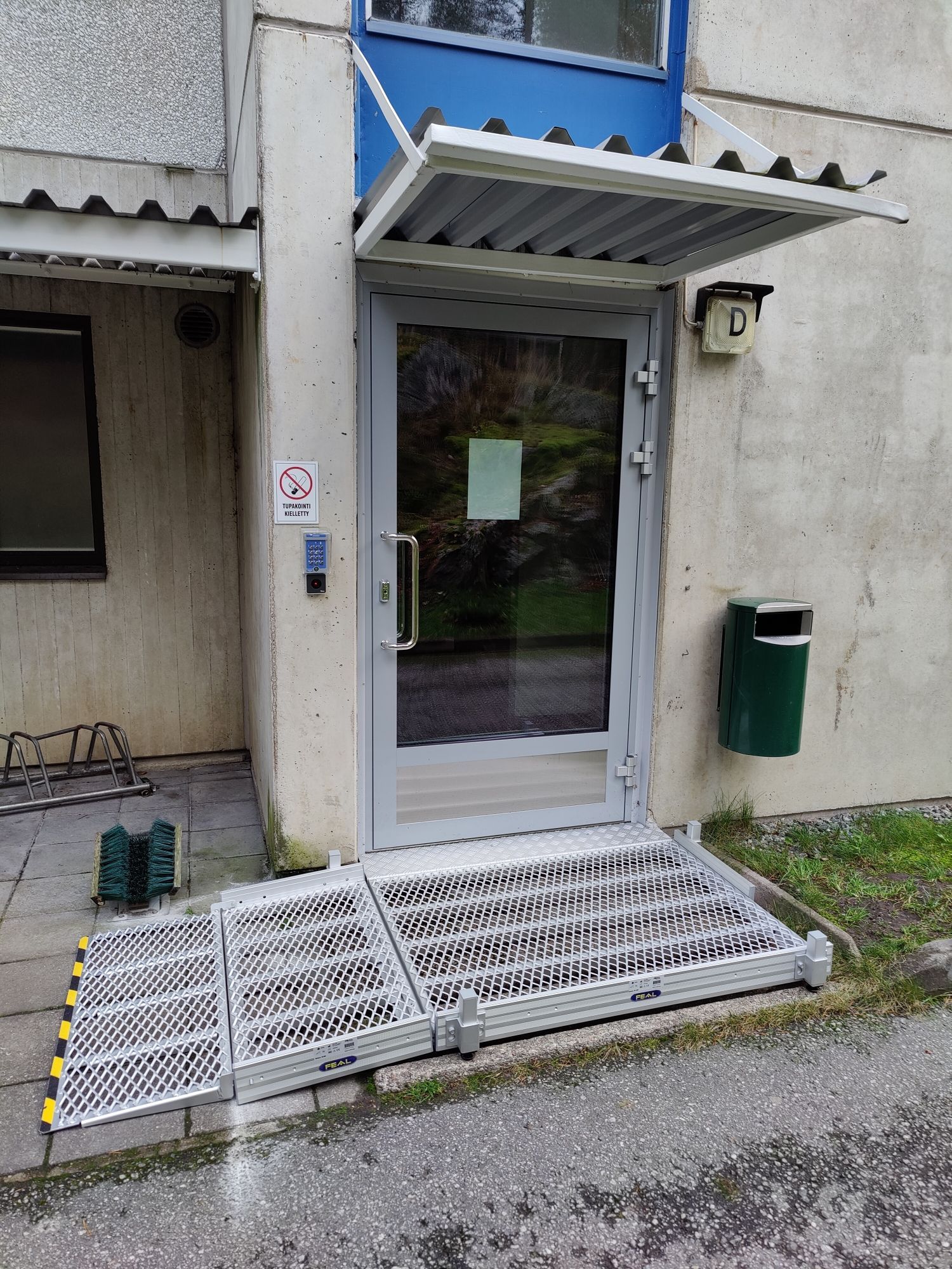 Pihalta porrastasanteelle portaisiin upotettu metalliturvaritilä. Porrastasanteelta ovitasanteelle luiska, jossa kestopuurunko ja kulkutasona metalliturvaritilä