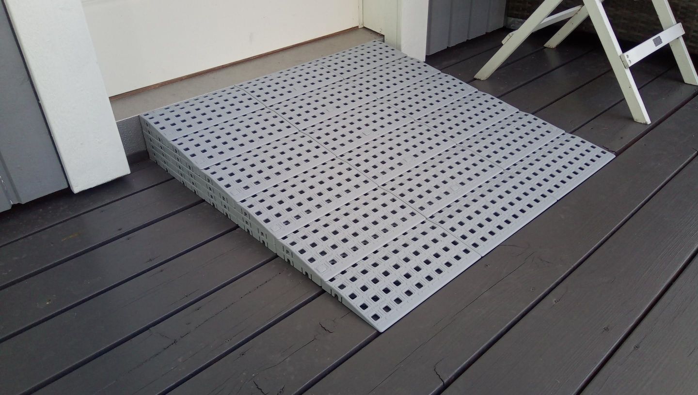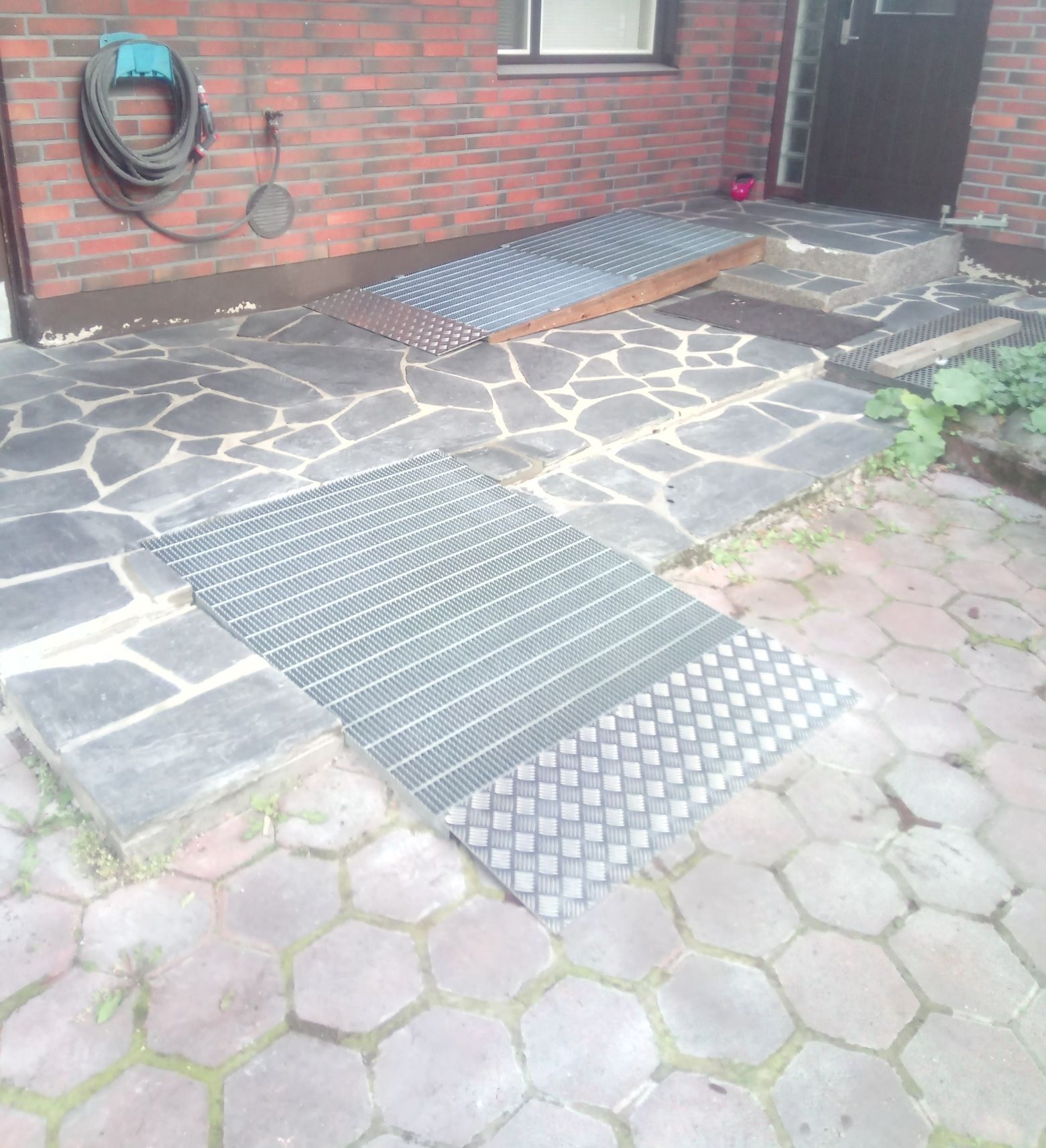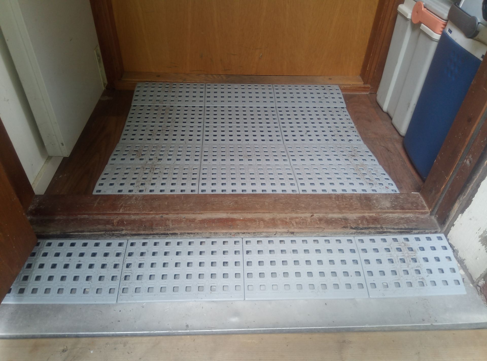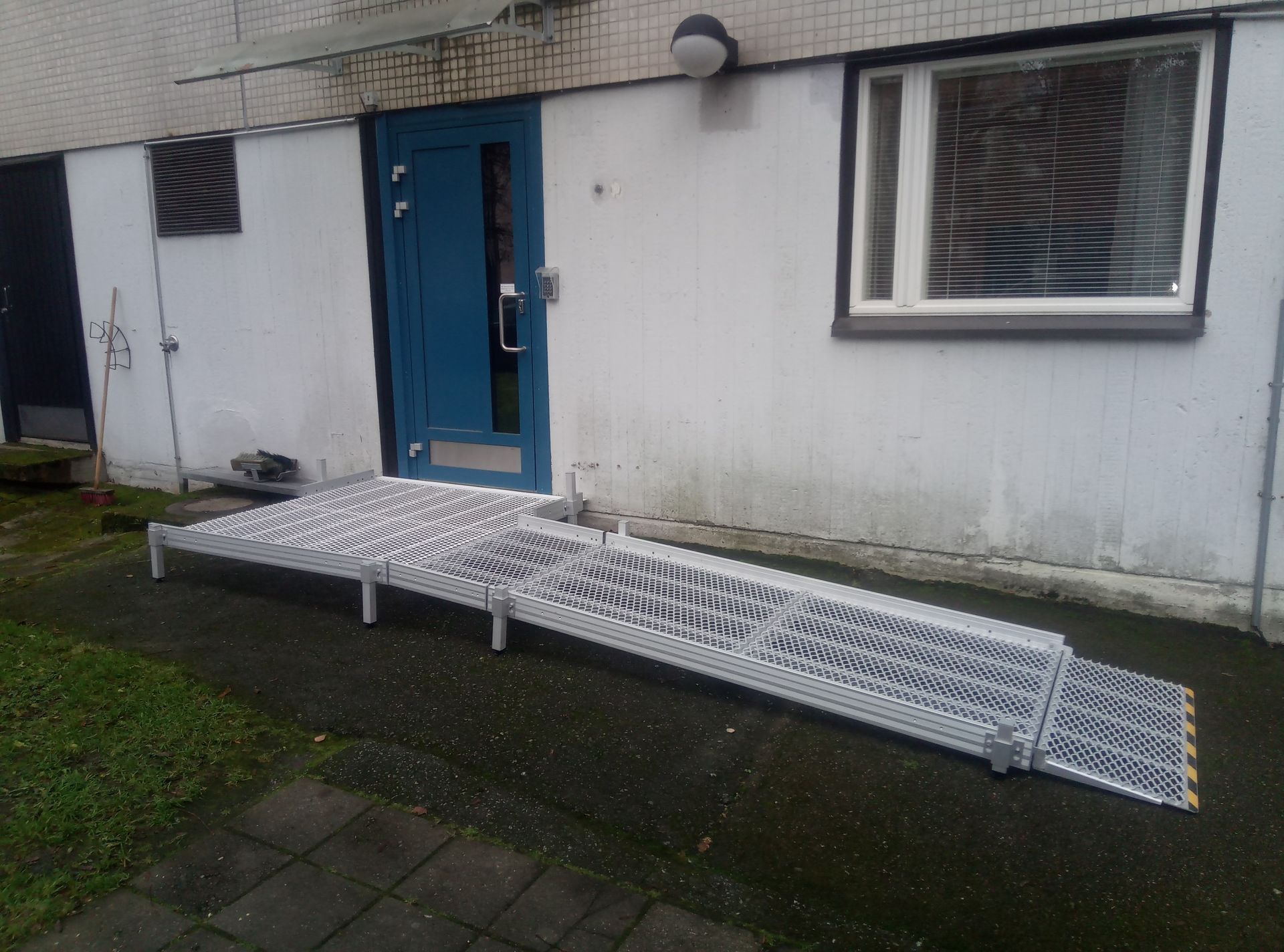 Pihalta porrastasanteelle portaisiin upotettu metalliturvaritilä. Porrastasanteelta ovitasanteelle luiska, jossa kestopuurunko ja kulkutasona metalliturvaritilä