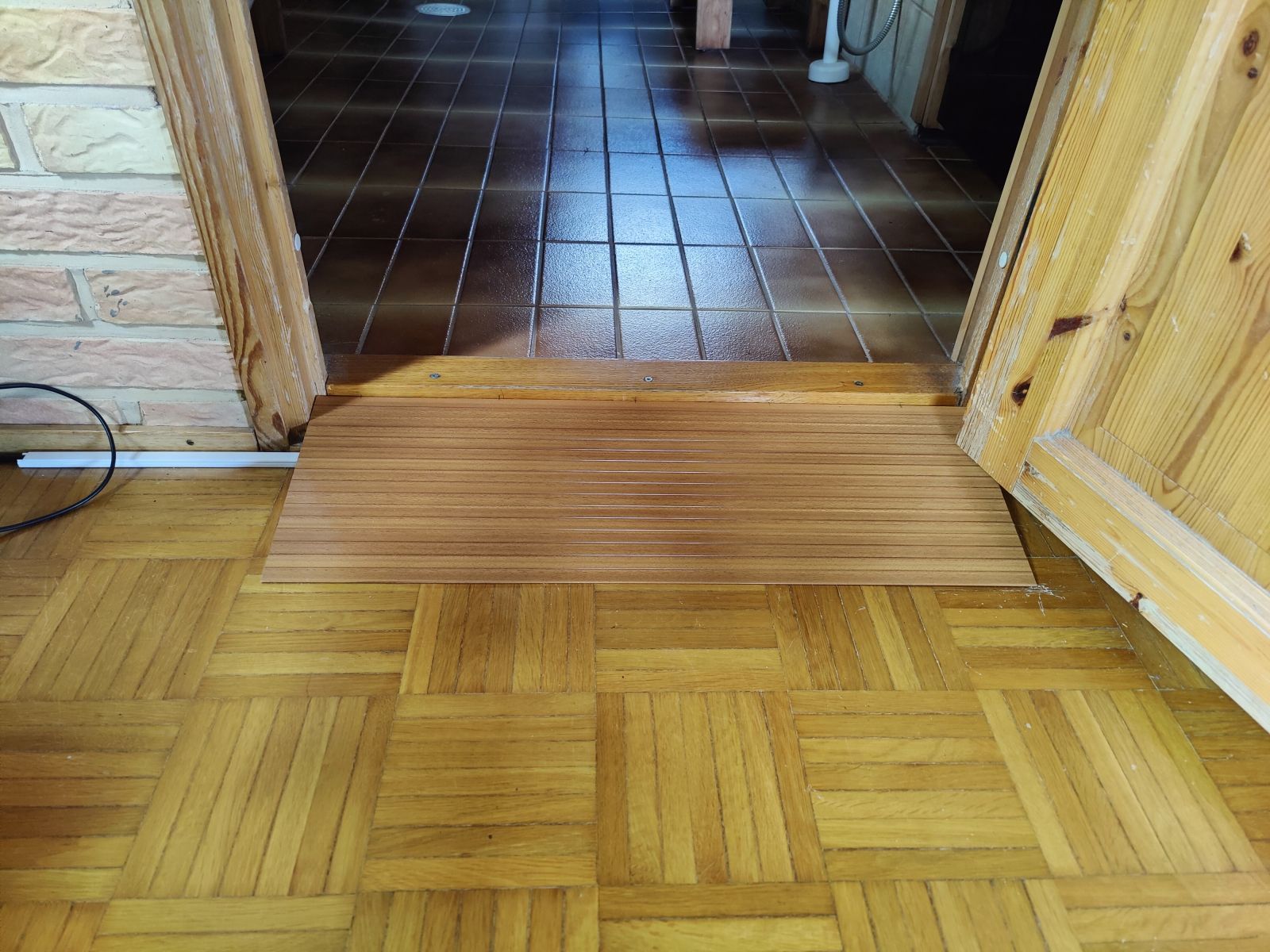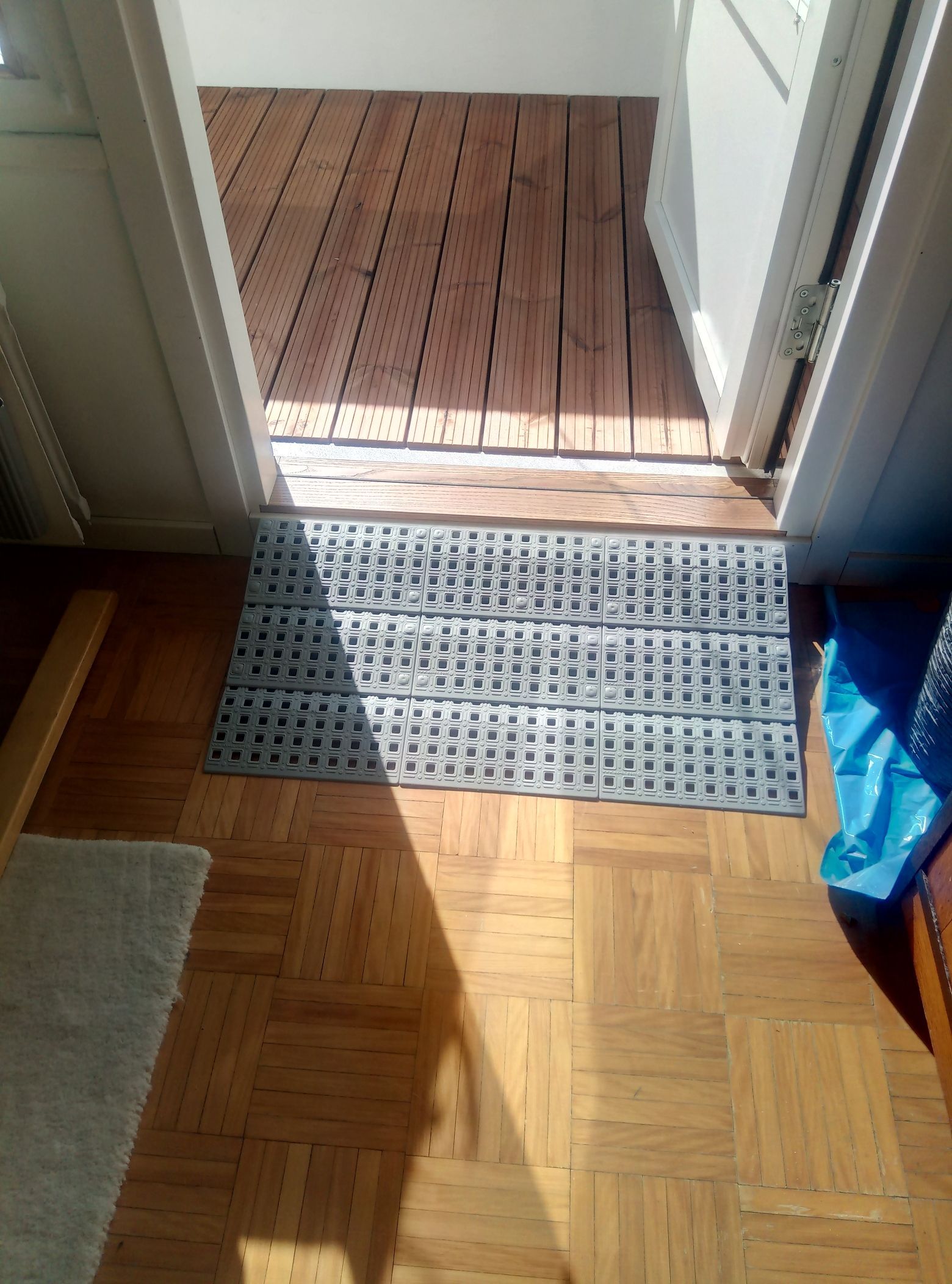Sisäpuolelle asennettu kynnysluiska. Parvekkeen lattia on korotettu lämpökäsitellyllä puutasolla mahdollisimman korkealle, kuitenkaan oven avautumista estämättä