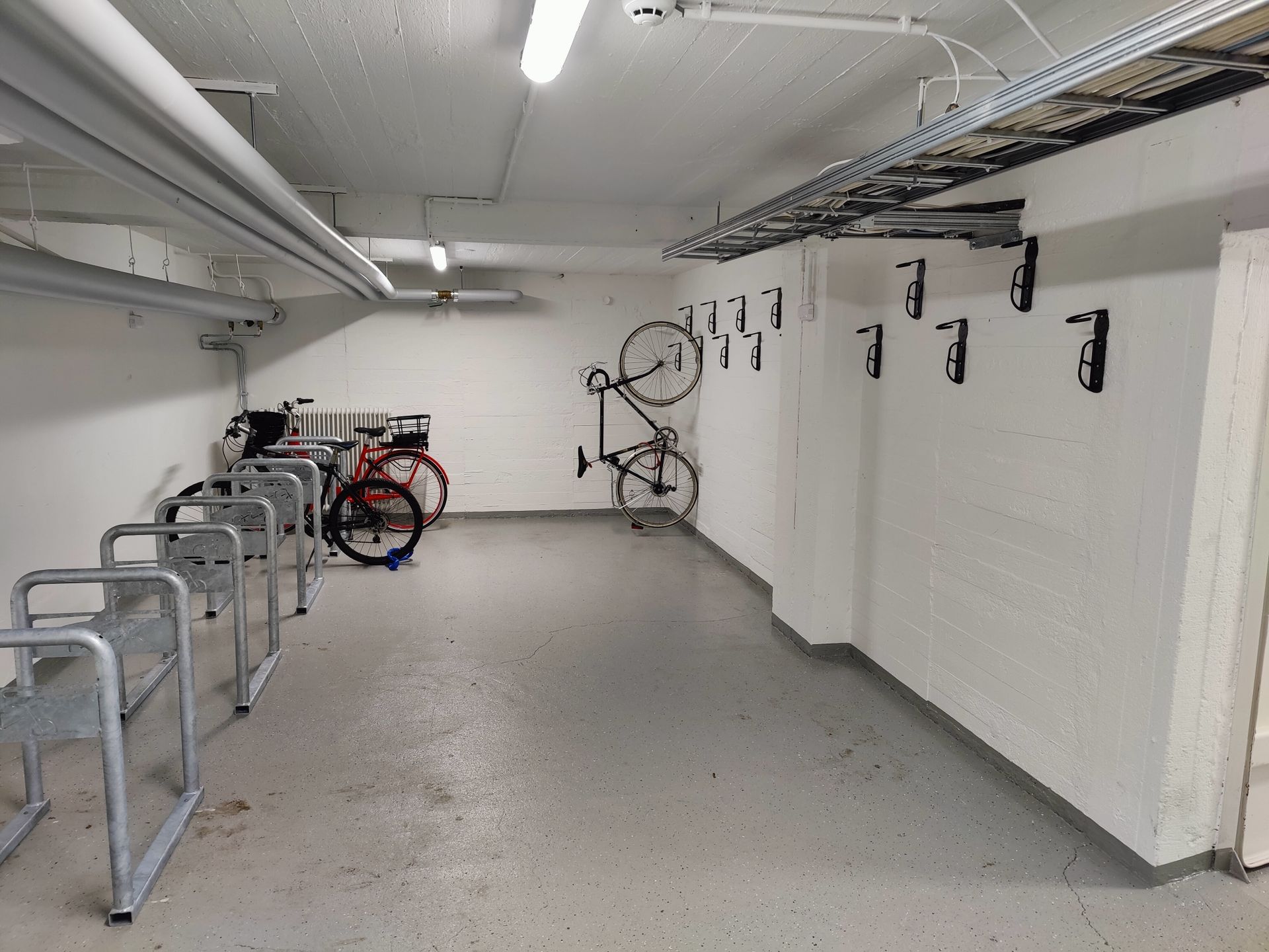 Pyörävaraston seinille on asennettu pyöräkoukut ja lattialle ulkotiloistakin tutut lukituskaaret
