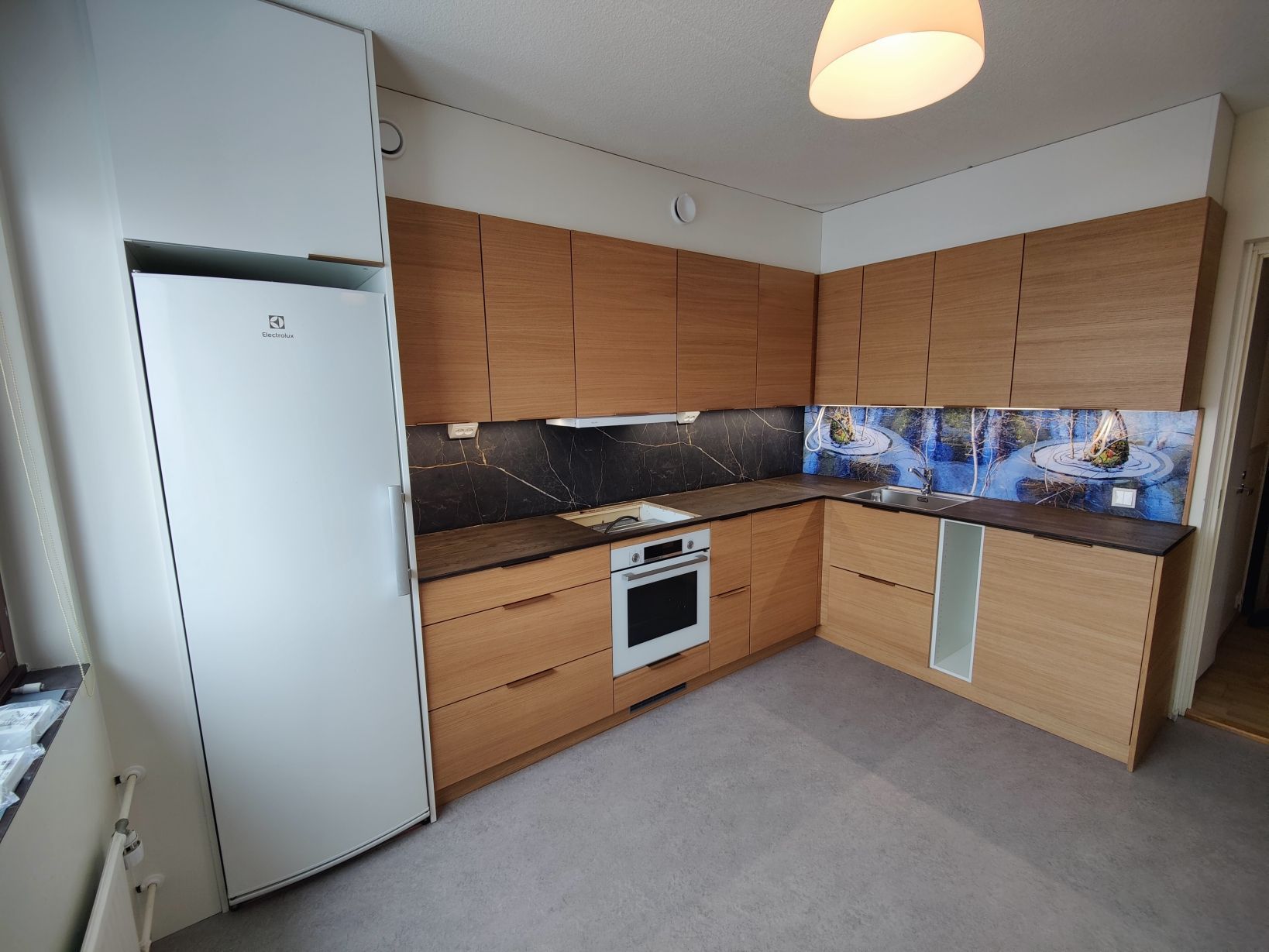 Koko keittiökaapisto ja lattia laitettu uusiksi. Asiakkaan ainutlaatuinen välitilalevy kruunaa kokonaisuuden.