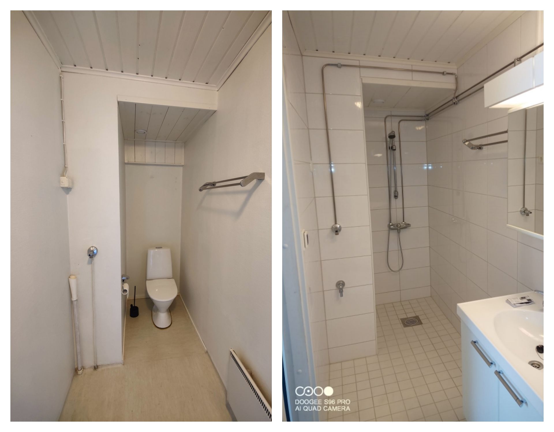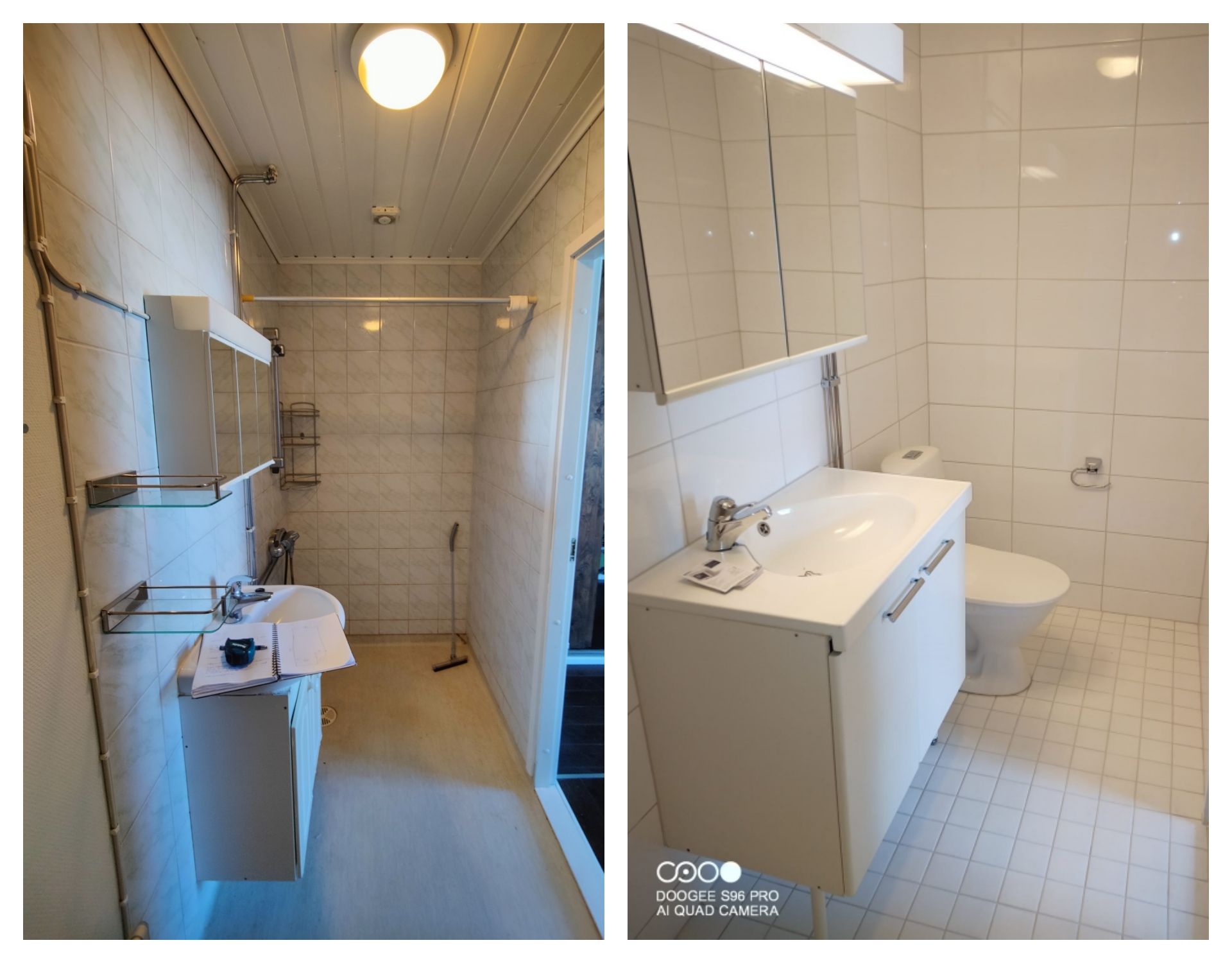 Ennen-jälkeen kuva. Ensimmäinen kuva samasta kohteesta, jossa suihku ja WC vaihtoivat paikkaa. Toteutus asiakkaalle avaimet käteen periaatteella.